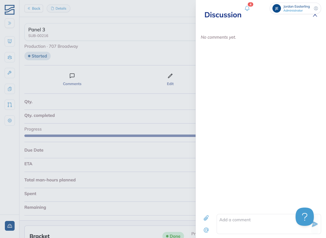 Open any order and click the Discussion icon to open the comments panel. Type your message and use @ to tag a specific teammate. They'll receive a Mention notification.