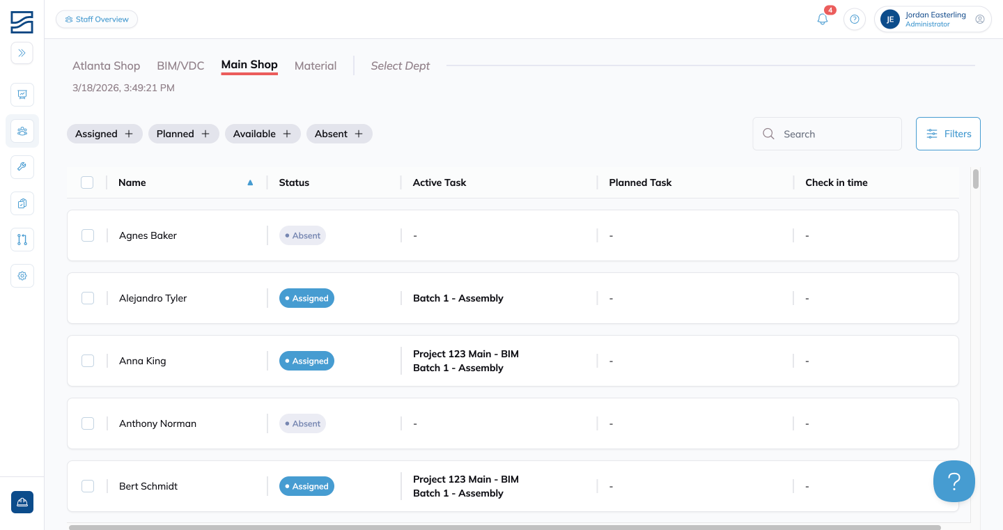 Staff Overview provides a real-time view of what each worker is currently doing, their status, their active and planned tasks, and their check-in time, all in one place.